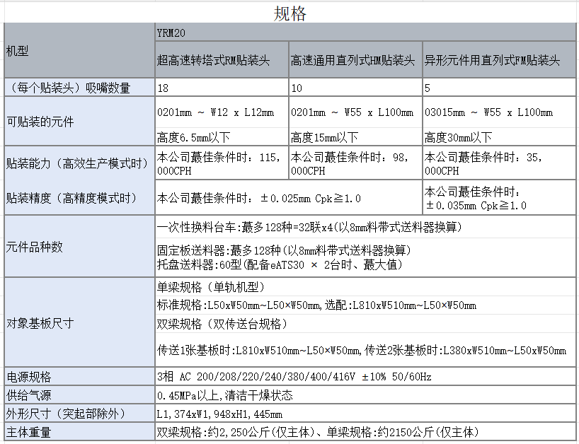雅马哈YAMAHA贴片机YRM20贴片机基本参数: